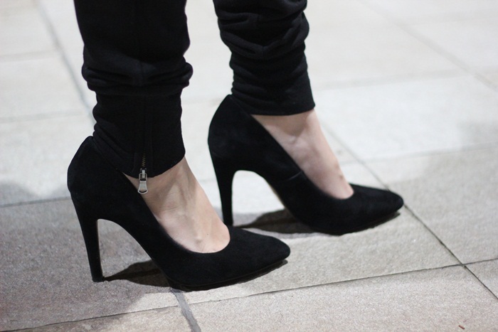 fashionable sweat pants and here they are, combined with heels and low bun. Call it what you want, but i like it! Hope you will feel the same!